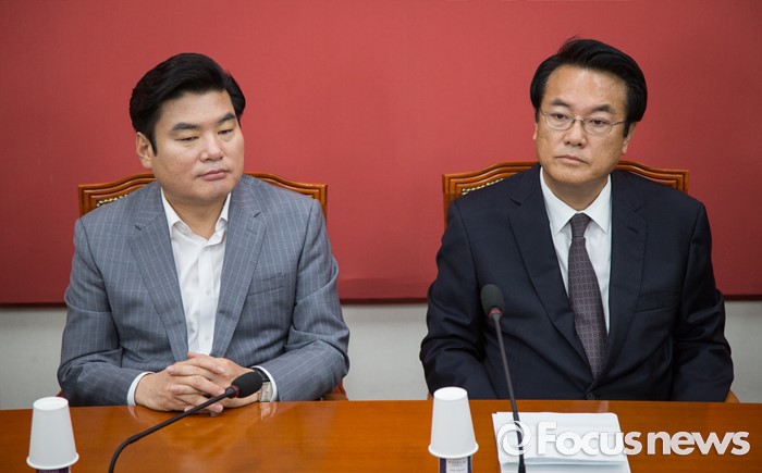 (서울=포커스뉴스) 정진석(오른쪽) 새누리당 원내대표와 원유철 전 원내대표가 20일 오전 서울 여의도 국회에서 열린 원내지도부-중진의원 연석회의에 참석해 자리하고 있다.