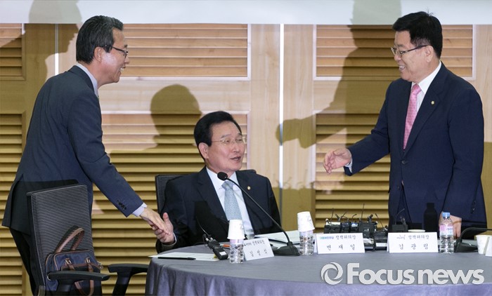 (서울=포커스뉴스) 20일 오전 서울 여의도 국회 의원회관에서 열린 1차 민생경제현안점검회의에 참석한 김광림(오른쪽부터) 새누리당 정책위의장, 변재일 더불어민주당 정책위의장, 김성식 국민의당 정책위의장이 인사하고 있다.
