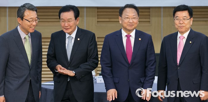 (서울=포커스뉴스) 20일 오전 서울 여의도 국회 의원회관에서 열린 1차 민생경제현안점검회의에 참석한 3당 정책위의장과 유일호 경제부총리 겸 기획재정부 장관이 취재진을 향해 포즈를 취하고 있다. 왼쪽부터 김성식 국민의당 정책위의장, 변재일 더불어민주당 정책위의장, 김광림 새누리당 정책위의장, 유 부총리.
