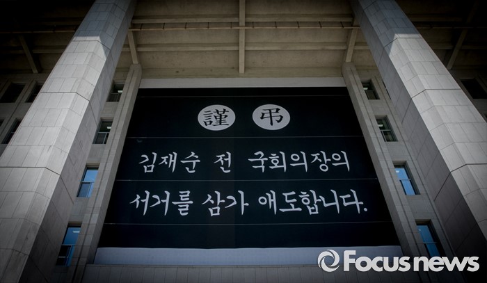 (서울=포커스뉴스) 20일 오전 서울 여의도 국회 본청에 지난 17일 별세한 김재순 전 국회의장을 추모하는 현수막이 걸려 있다.