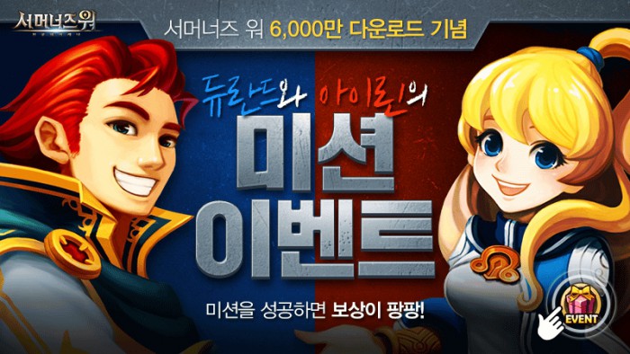 한편 컴투스는 이번 서머너즈 워 6000만 다운로드를 기념해 다음달 2일까지 게임 내에서 '듀란드와 아이린의 미션 이벤트'를 진행한다. 게임 속 대표 캐릭터인 아이린과 듀란드가 각각 제공하는 미션을 수행하고 완료 횟수에 따라 보상을 지급하는 이벤트다.