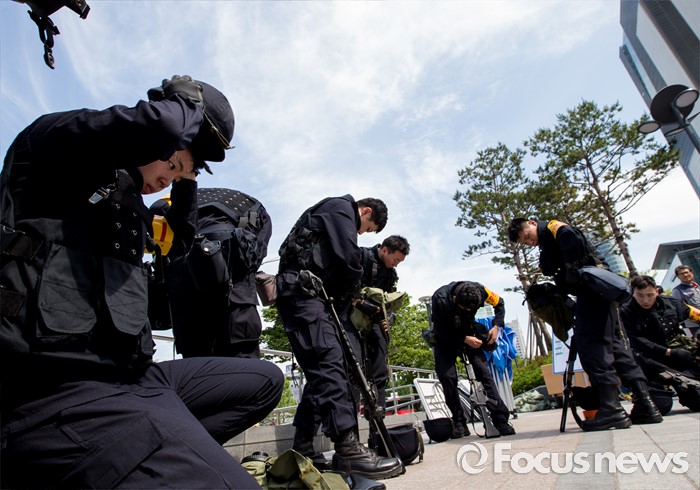 (서울=포커스뉴스) 20일 오후 서울 강남구 코엑스에서 열린 '2016 재난대응 안전한국훈련'에 참여한 훈련병력들이 테러대응훈련을 펼치고 있다.