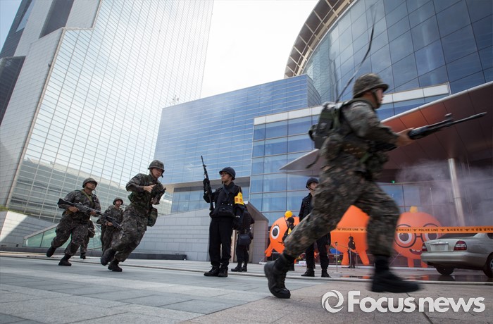 (서울=포커스뉴스) 20일 오후 서울 강남구 코엑스에서 열린 '2016 재난대응 안전한국훈련'에 참여한 훈련병력들이 테러대응훈련을 펼치고 있다.
