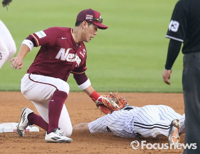 (서울=포커스뉴스) 20일 서울 잠실구장에서 열린 2016 프로야구 넥센-LG 경기 2회말 1사후 우전 안타로 진루한 LG 오지환이 정상호 타석때 2루 도루를 시도하다 넥센 서건창에게 태그 아웃되고 있다.