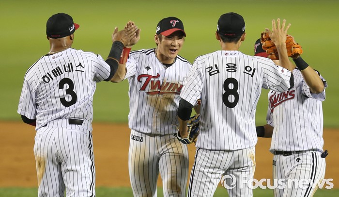 (서울=포커스뉴스) 20일 서울 잠실구장에서 열린 2016 프로야구 넥센-LG 경기에서 역전승한 LG 내야수들이 마운드에 모여 하이파이브하며 승리의 기쁨을 나누고 있다.