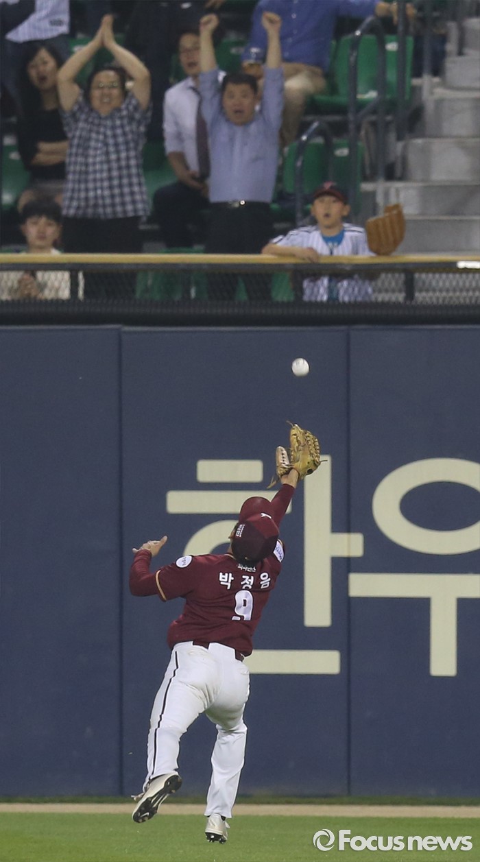 (서울=포커스뉴스) 20일 서울 잠실구장에서 열린 2016 프로야구 넥센-LG 경기 8회말 1사 3루에서 LG 정성훈의 타구가 넥센 우익수 박정음의 키를 넘어가고 있다.