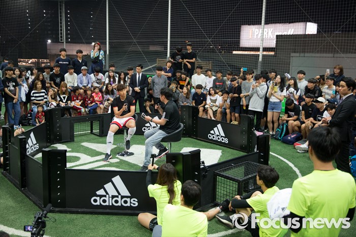 (서울=포커스뉴스) 손흥민이 20일 오후 서울 용산구 아이파크몰 풋살경기장에서 열린 아디다스 손흥민 팬미팅 및 사인회에서 팬들과 근황토크를 하고 있다.
