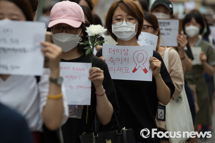 (서울=포커스뉴스) 21일 오후 서울 서초구 강남역 10번 출구 인근에서 시민들이 '강남역 여성혐오 살인사건 추모 집회'에 참석해 행진하고 있다.