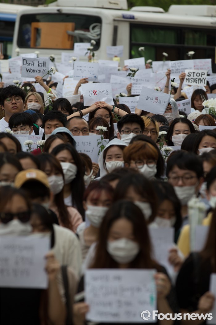 (서울=포커스뉴스) 21일 오후 서울 서초구 강남역 10번 출구 인근에서 시민들이 '강남역 여성혐오 살인사건 추모 집회'에 참석해 행진을 마친 뒤 피켓을 들고 있다.