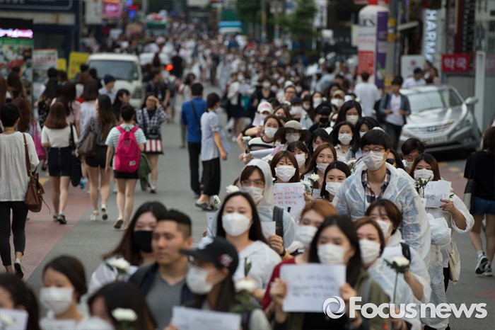 (서울=포커스뉴스) 21일 오후 서울 서초구 강남역 10번 출구 인근에서 시민들이 '강남역 여성혐오 살인사건 추모 집회'에 참석해 행진하고 있다.