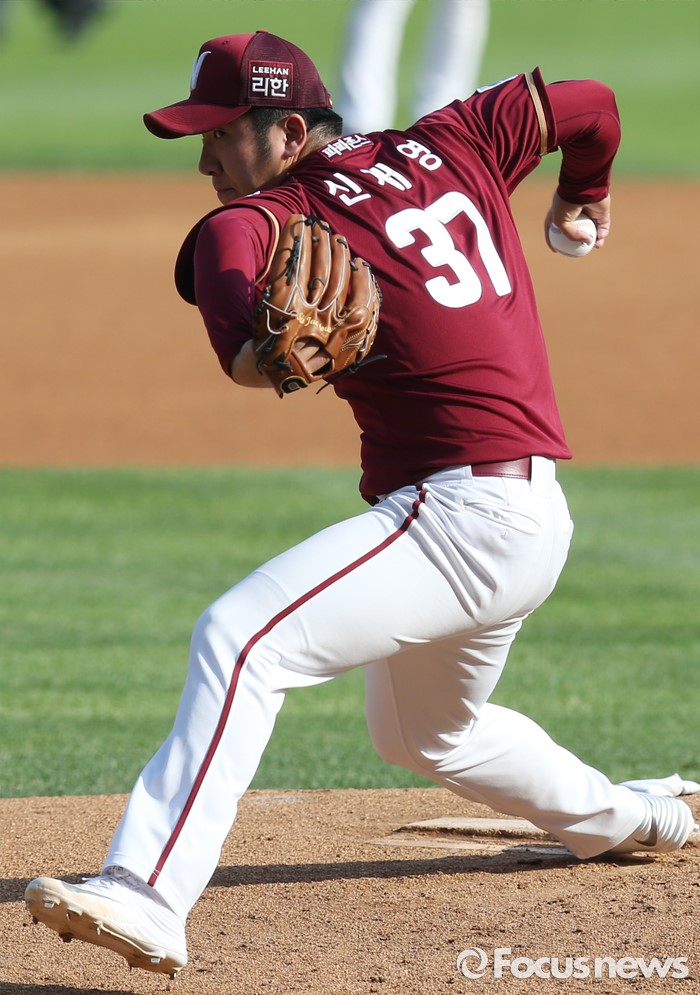 (서울=포커스뉴스) 22일 서울 잠실구장에서 열린 2016 프로야구 넥센-LG 경기에서 1회말 넥센 선발투수 신재영이 투구하고 있다.