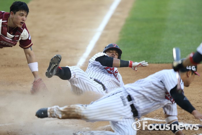 (서울=포커스뉴스) 22일 서울 잠실구장에서 열린 2016 프로야구 넥센-LG 경기 7회말 1사 1,2루에서 LG 박용택의 좌중간 2루타때 2루주자 최경철에 이어 1루주자 히메네스가 홈으로 뛰어들었으나 넥센 포수 박동원에게 태그아웃되고 있다.