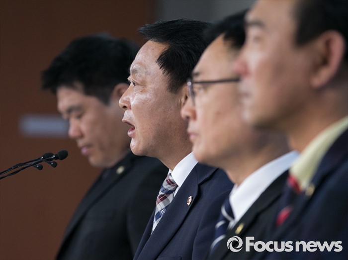(서울=포커스뉴스) 23일 오전 서울 여의도 국회 정론관에서 박재만(오른쪽부터) 전북도의회 의원, 이광희 충북도의회 의원, 임채호 경기도의회 의원 등이 지방의원의 후원회 제한한 정치자금법 제6호에 대한 헌법소원심판 청구 기자회견을 하고 있다.