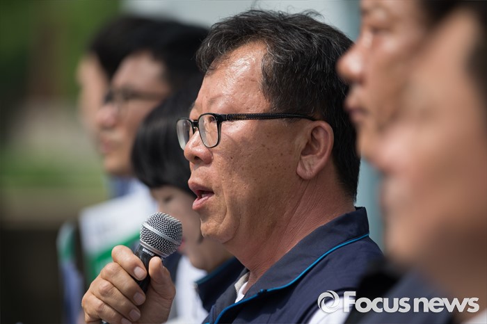 (서울=포커스뉴스) 23일 오전 서울 종로구 정부서울청사 앞에서 열린 한국정부의 불법지침과 사업장 시행 강행에 대한 ILO 제소 양대노총 기자회견에 참석한 최종진 민주노총 위원장 직무대행이 모두발언을 하고 있다.