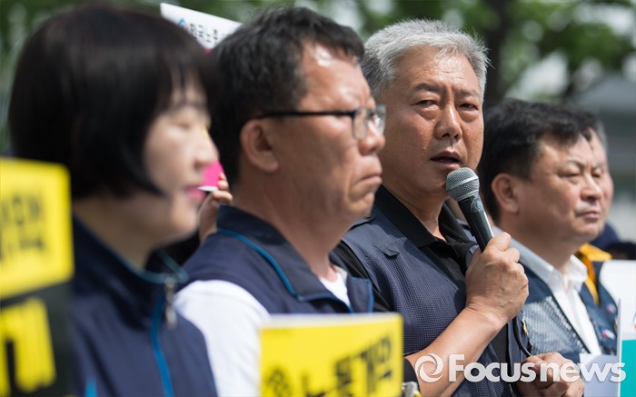 (서울=포커스뉴스) 23일 오전 서울 종로구 정부서울청사 앞에서 열린 한국정부의 불법지침과 사업장 시행 강행에 대한 ILO 제소 양대노총 기자회견에 참석한 김동만(오른쪽 두번째) 한국노총 위원장이 모두발언을 하고 있다.