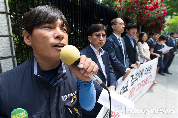 (서울=포커스뉴스) 엄기한(왼쪽) 전국금속노조 유성기업지회 대외협력부장이 23일 오전 서울 종로구 서울지방경찰청 앞에서 현대자동차 양재동 사옥 앞 집회에 대한 경찰의 위법한 공권력 행사 규탄 기자회견 중 모두발언 하고 있다.