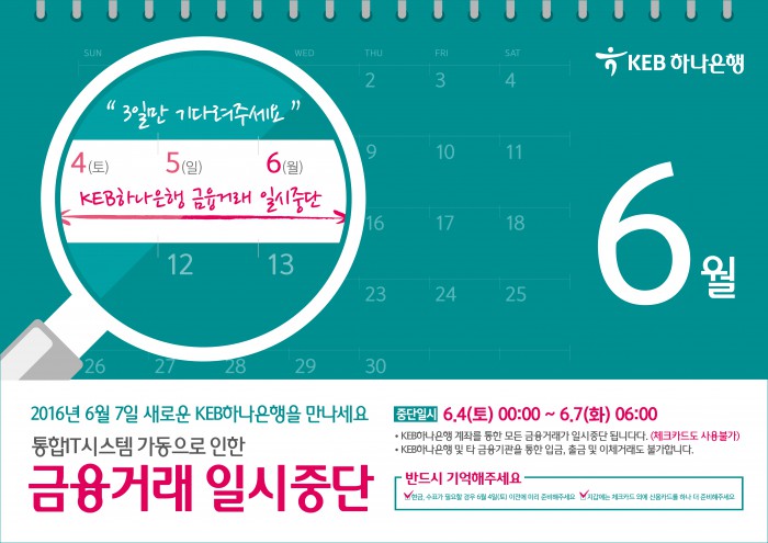 하나은행의 자동화기기 중단 시간은 6월 4일 자정이며, 외환은행 자동화기기는 이보다 조금 더 빠른 6월 3일 오후 4시부터 사용이 중단된다.