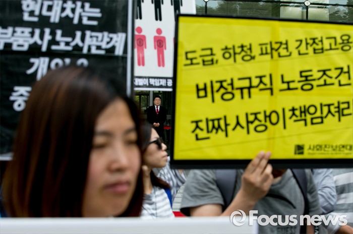 (서울=포커스뉴스) 23일 오전 서울 여의도 전국경제인연합회 앞에서 관계자들이 민주노총과 시민사회단체 등으로 구성된 재벌책임공동행동의 전경련 규탄 및 서울대행진 출발 기자회견을 지켜보고 있다.
