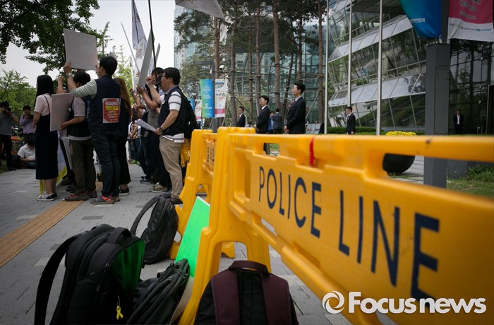 (서울=포커스뉴스) 23일 오전 서울 여의도 전국경제인연합회 앞에서 민주노총과 시민사회단체 등으로 구성된 재벌책임공동행동이 전경련 규탄 및 서울대행진 출발 기자회견을 하고 있다.