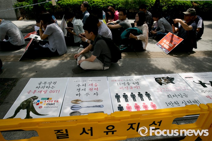 (서울=포커스뉴스) 23일 오후 서울 여의도 산업은행 본점 앞에서 민주노총과 시민사회단체 등으로 구성된 재벌책임공동행동이 규탄 및 서울대행진 출발 기자회견을 하고 있다.