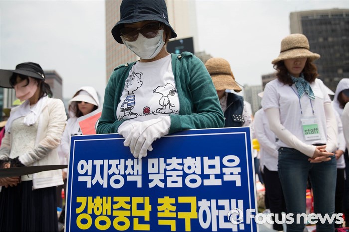 (서울=포커스뉴스) 23일 오후 서울 중구 시청광장에서 보육관계자들이 '어린이집 0~2세 맞춤형보육 제도개선 및 시행 연기'를 촉구하며 결의대회를 하고 있다.