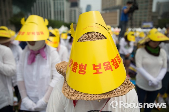 (서울=포커스뉴스) 23일 오후 서울 중구 시청광장에서 보육관계자들이 '어린이집 0~2세 맞춤형보육 제도개선 및 시행 연기'를 촉구하며 결의대회를 하고 있다.
