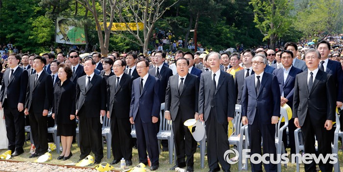 (김해=포커스뉴스) 23일 오후 경남 김해 봉하마을에서 엄수된 故 노무현 전 대통령 서거 7주기 추도식에 참석한 내빈들이 애국가를 제창하고 있다. 앞줄 왼쪽부터 김홍걸 더불어민주당 국민통합위원장, 노 전 대통령 장남 건호 씨, 부인 권양숙 여사, 김원기, 임채정 전 국회의장, 이해찬 노무현재단 이사장, 문희상 더불어민주당 의원, 고영구 전 국정원장, 이병완 전 대통령 비서실장, 문재인 더불어민주당 전 대표.
