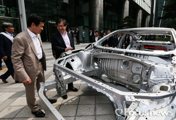 한편 포스코는 한국GM에 주요 협력 파트너로서 고품질 자동차 강판을 공급하고 있다. 이날 포스코센터 앞에 전시된 쉐보레 브랜드의 올 뉴 말리부 차량도 차체 강판으로 포스코의 초고장력강판((AHSS: Advanced High Strength Steel)을 사용했다.포스코의 초고장력강판으로 만들어진 한국GM의 올 뉴 말리부 차량의 차체를 살펴보고 있는 권오준 포스코 그룹 회장(오른쪽)과 제임스 김 한국GM 사장. <사진제공=한국GM>