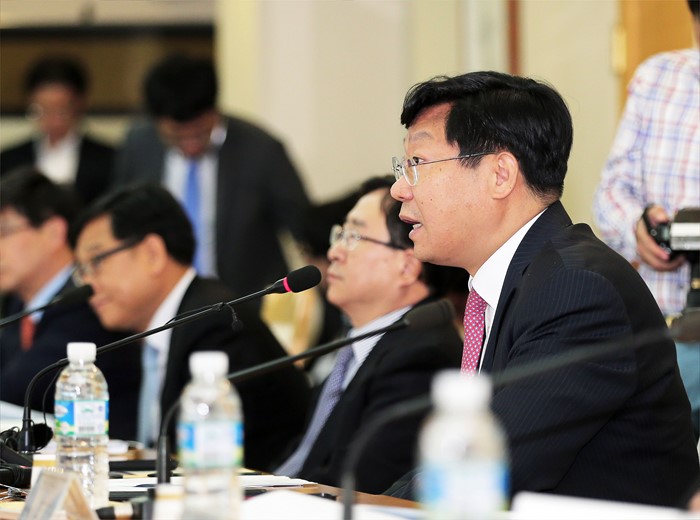 (울산=포커스뉴스) 주형환(오른쪽) 산업통상자원부 장관이 23일 오후 울산시 울산상공회의소 회의실에서 열린 울산지역 기업인과의 간담회에 참석해인사말을 하고 있다.
