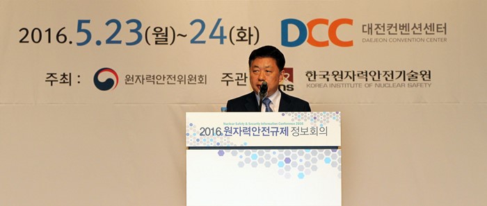 (대전=포커스뉴스) 김용환 원자력안전위원회 위원장이 23일 대전 컨벤션센터에서 열린 2016원자력안전규제정보회의에 참석해 축사를 하고 있다. <사진제공=원자력안전위원회>