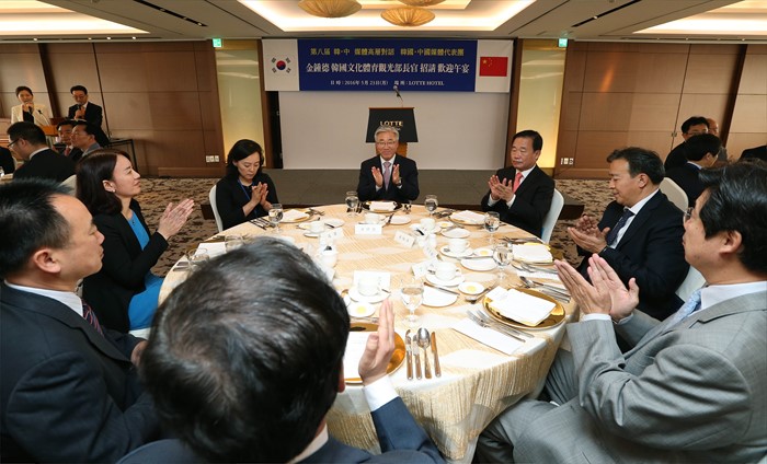 (서울=포커스뉴스) 23일 서울 중구 롯데호텔에서 문화체육관광부와 중국 국무원신문판공실이 주최하고 21세기 한중교류협회가 주관하는 제8차 한중 고위언론인 포럼 개회식이 열렸다. 김종덕 문체부 장관이 문화체육관광부 주최 환영 오찬에 한중 고위언론인들과 참석하고 있다. <사진제공=문화체육관광부>