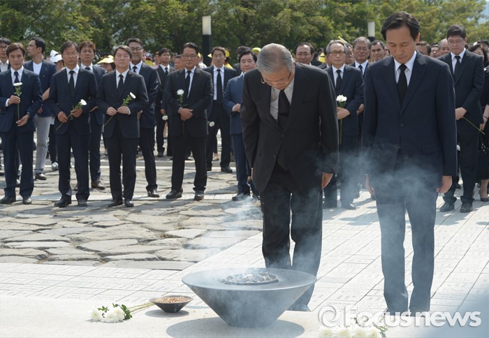 (김해=포커스뉴스) 23일 오후 경남 김해 봉하마을에서 엄수된 故 노무현 전 대통령 서거 7주기 추도식을 마친 뒤 김종인(왼쪽) 더불어민주당 비대위 대표, 우상호 원내대표가 묘역 참배 및 헌화를 하고 있다.