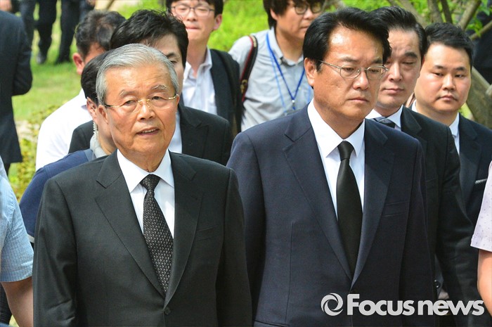 (김해=포커스뉴스) 23일 오후 경남 김해 봉하마을에서 엄수된 故 노무현 전 대통령 서거 7주기 추도식에 정진석(오른쪽) 새누리당 원내대표, 김종인 더불어민주당 비대위 대표가 참석하고 있다.