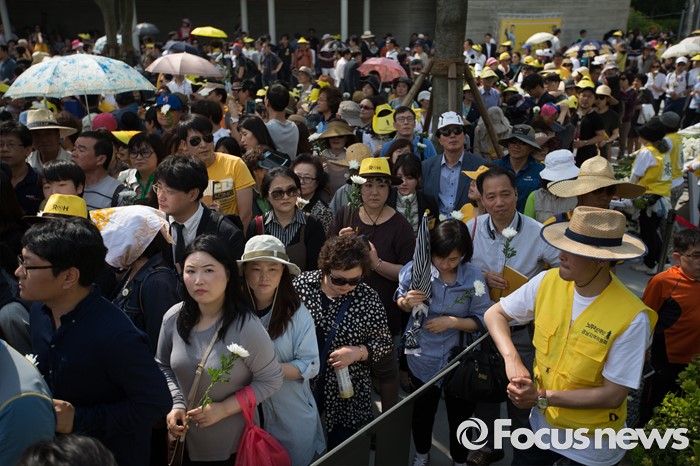 (김해=포커스뉴스)故 노무현 전 대통령 서거 7주기인 23일 오후 경남 김해시 진영읍 봉하마을에서 열린 '故 노무현 전 대통령 서거 7주기 추도식'에서 추도객들이 헌화 순서를 기다리고 있다.