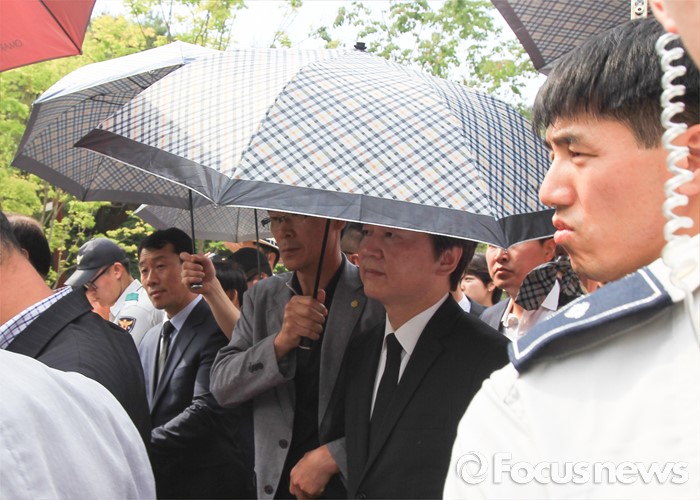 (김해=포커스뉴스) 23일 오후 경남 김해 봉하마을에서 엄수된 故 노무현 전 대통령 서거 7주기 추도식을 마친 뒤 안철수 국민의당 상임공동대표가 우산을 쓴 채 식장을 나서고 있다.