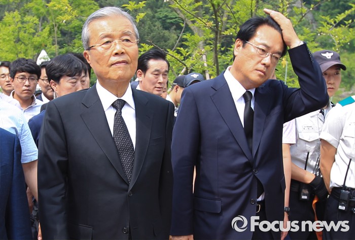 (김해=포커스뉴스) 23일 오후 경남 김해 봉하마을에서 엄수된 故 노무현 전 대통령 서거 7주기 추도식에 정진석(오른쪽) 새누리당 원내대표, 김종인 더불어민주당 비대위 대표가 참석하고 있다.