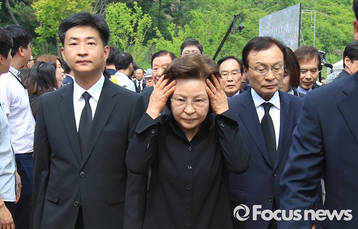 (김해=포커스뉴스) 23일 오후 경남 김해 봉하마을에서 엄수된 故 노무현 전 대통령 서거 7주기 추도식에 노 전 대통령 부인 권양숙(가운데) 여사와 장남 건호(왼쪽) 씨, 이해찬 노무현재단 이사장이 참석하고 있다.