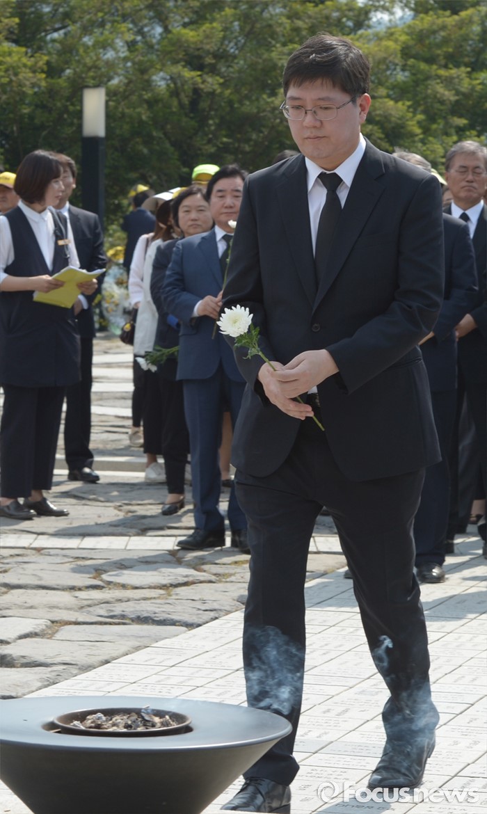 (김해=포커스뉴스) 23일 오후 경남 김해 봉하마을에서 엄수된 故 노무현 전 대통령 서거 7주기 추도식을 마친 뒤 김홍걸 더불어민주당 국민통합위원장이 묘역 참배 및 헌화를 하고 있다.