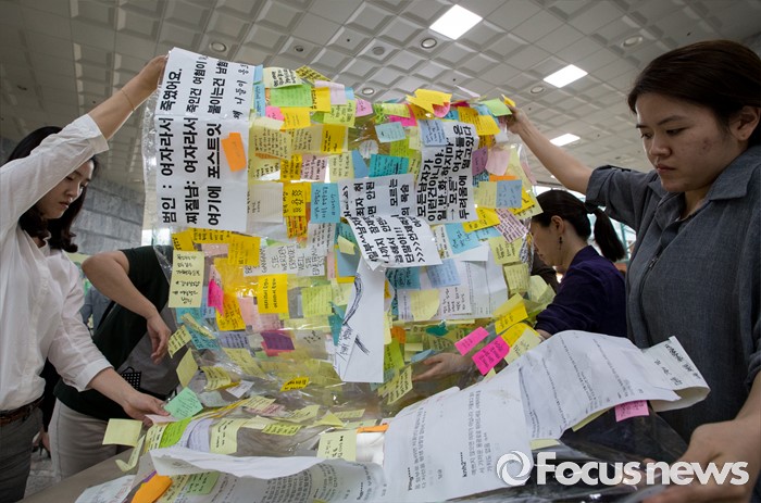 (서울=포커스뉴스) 23일 오후 서울 동작구 서울여성플라자 로비에 마련된 추모 전시장에서 여성가족재단 직원들이 강남역 묻지마 살인 피해자 추모 기록물들을 정리하고 있다.
