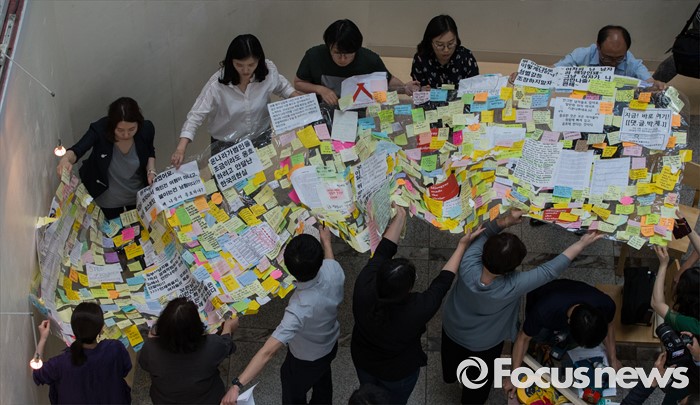 (서울=포커스뉴스) 23일 오후 서울 동작구 서울여성플라자 로비에 마련된 추모 전시장에서 여성가족재단 직원들이 강남역 묻지마 살인 피해자 추모 기록물들을 게시하고 있다.