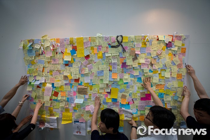 (서울=포커스뉴스) 23일 오후 서울 동작구 서울여성플라자 로비에 마련된 추모 전시장에서 여성가족재단 직원들이 강남역 묻지마 살인 피해자 추모 기록물들을 게시하고 있다.