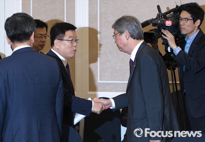 (서울=포커스뉴스) 24일 오전 서울 여의도 국회 귀빈식당에서 열린 조선·해운업 구조조정 관련 당정협의에 참석한 김광림(왼쪽) 새누리당 정책위의장과 임종룡 금융위원장이 인사하고 있다.