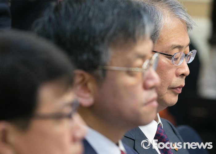(서울=포커스뉴스) 24일 오전 서울 여의도 국회 귀빈식당에서 열린 조선·해운업 구조조정 관련 당정협의에 참석한 임종룡(오른쪽 첫번째) 금융위원장 등 참석자들이 김광림 새누리당 정책위의장의 발언을 듣고 있다.