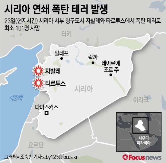 (서울=포커스뉴스) 23일(현지시간) 시리아에서 발생한 연쇄 폭탄 테러로 최소 101명이 사망했다고 외신이 보도했다. 이슬람국가(IS)는 자신들의 소행이라며 배후를 자처했다.