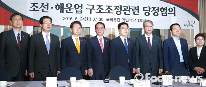 이날 당정협의에는 새누리당 김광림 정책위의장·김도읍 원내수석부대표·김한표(경남 거제) 의원, 정부 측 임종룡 금융위원장·최상묵 기재부 1차관·고영선 고용노동부 차관 등이 참석했다.24일 오전 서울 여의도 국회 귀빈식당에서 열린 조선·해운업 구조조정 관련 당정협의에 참석한 김광림 새누리당 정책위의장, 임종룡 금융위원장 등 참석자들이 취재진을 향해 포즈를 취하고 있다. 왼쪽부터 이관섭 산업통상자원부 1차관, 이만희 새누리당 원내부대표, 김한표 의원, 김도읍 원내수석부대표, 김광림 정책위의장, 임종룡 금융위원장, 성일종 원내부대표, 임이자 당선인. 2016.05.24 박동욱 기자 24일 오전 서울 여의도 국회 귀빈식당에서 열린 조선·해운업 구조조정 관련 당정협의에 참석한 김광림 새누리당 정책위의장이 모두발언을 하고 있다. 2016.05.24 박동욱 기자 24일 오전 서울 여의도 국회 귀빈식당에서 열린 조선·해운업 구조조정 관련 당정협의에 참석한 임종룡 금융위원장이 모두발언을 하고 있다. 2016.05.24 박동욱 기자