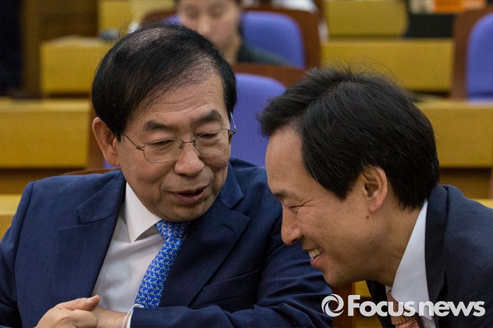(서울=포커스뉴스) 우상호(오른쪽) 더불어민주당 원내대표와 박원순 서울시장이 24일 오전 서울 여의도 국회의원회관에서 열린 '지자체장 초청 일자리 정책 콘서트'에 참석해 대화를 나누고 있다.