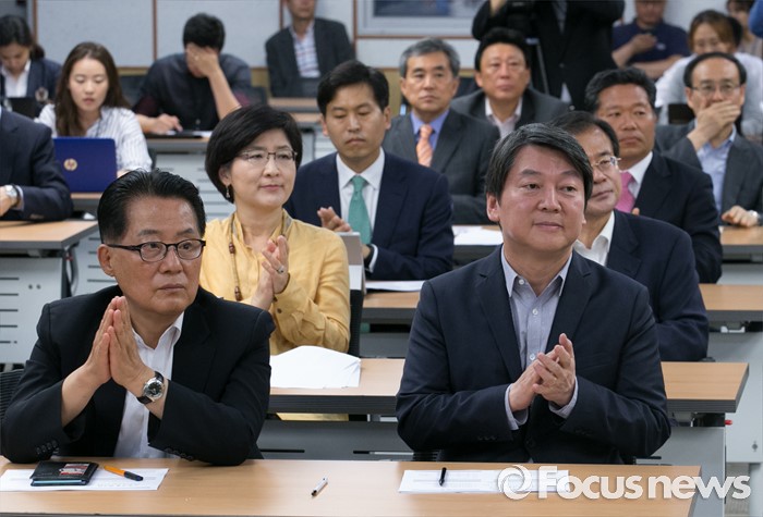 (서울=포커스뉴스) 24일 오전 서울 여의도 국회 의원회관에서 열린 국민의당 6차 정책역량강화 워크숍에 참석한 안철수(오른쪽) 상임공동대표와 박지원 원내대표 등 의원 및 당선인들이 박수치고 있다.