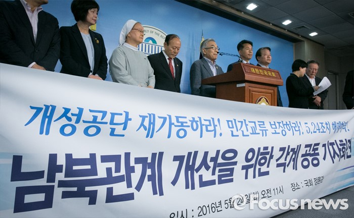 (서울=포커스뉴스) 24일 오전 서울 여의도 국회 정론관에서 홍익표 더불어민주당 의원, 이정미 정의당 당선인, 윤종오 무소속 당선인과 6·15 남측위원회 등 각계 종교 및 시민사회 대표들이 남북관계 개선을 위한 공동 기자회견을 하고 있다.