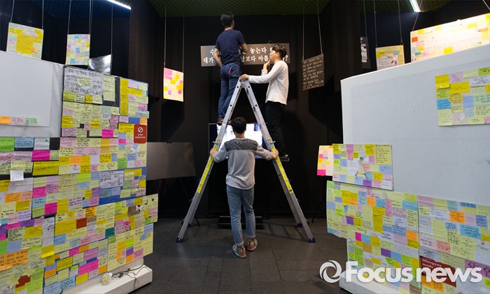 (서울=포커스뉴스) 24일 오전 강남역 인근 주점 화장실 살인사건 피해자 추모 공간이 옮겨진 서울시청 시민청에서 관계자들이 추모공간을 정리하고 있다.