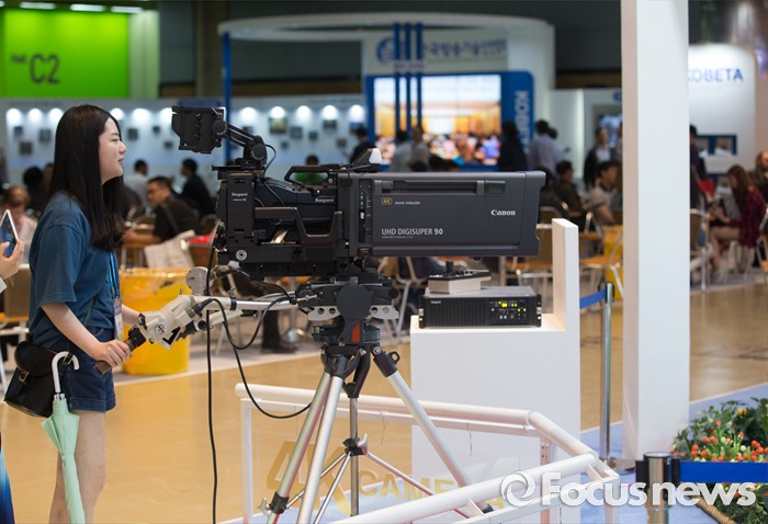 (서울=포커스뉴스) 24일 오전 서울 강남구 코엑스에서 열린 '제26회 국제 방송·음향·조명기기 전시회'를 찾은 한 관람객이 방송카메라를 체험해보고 있다.